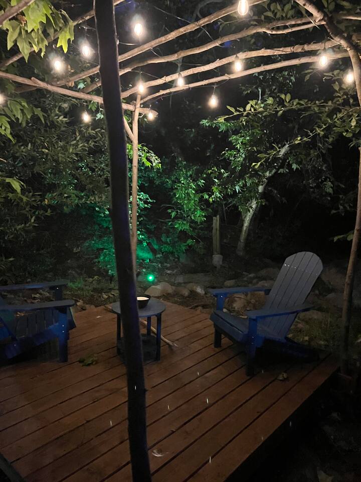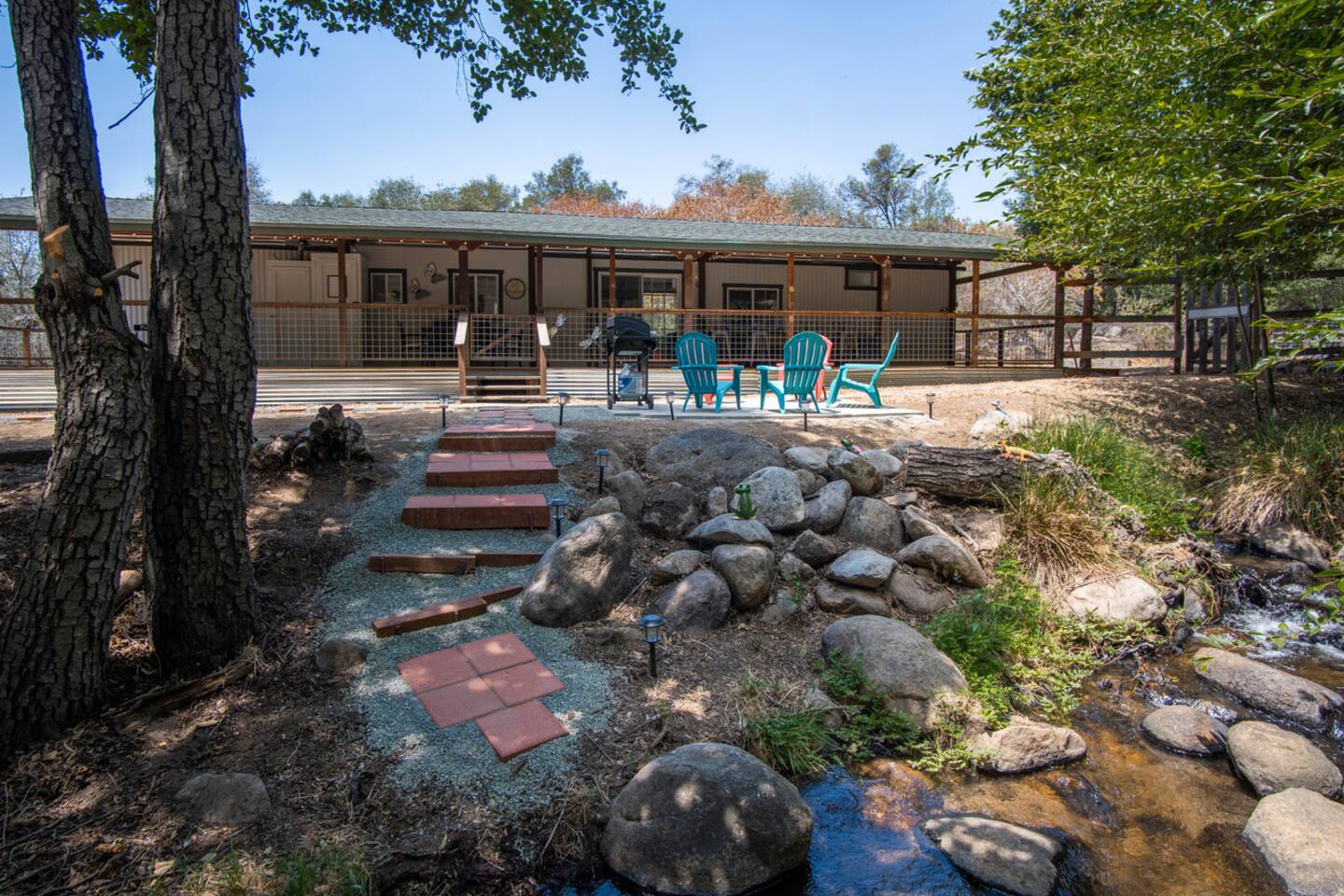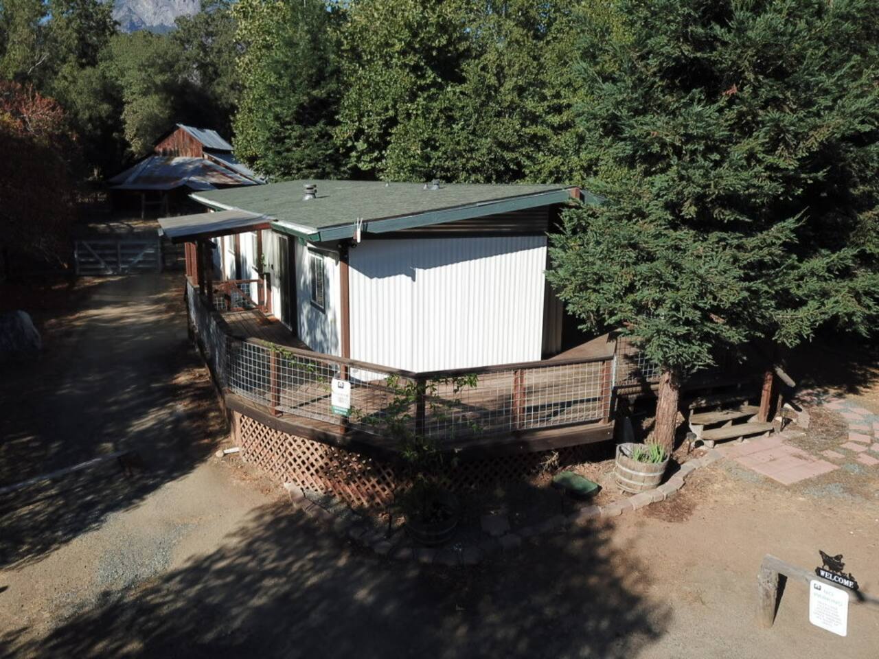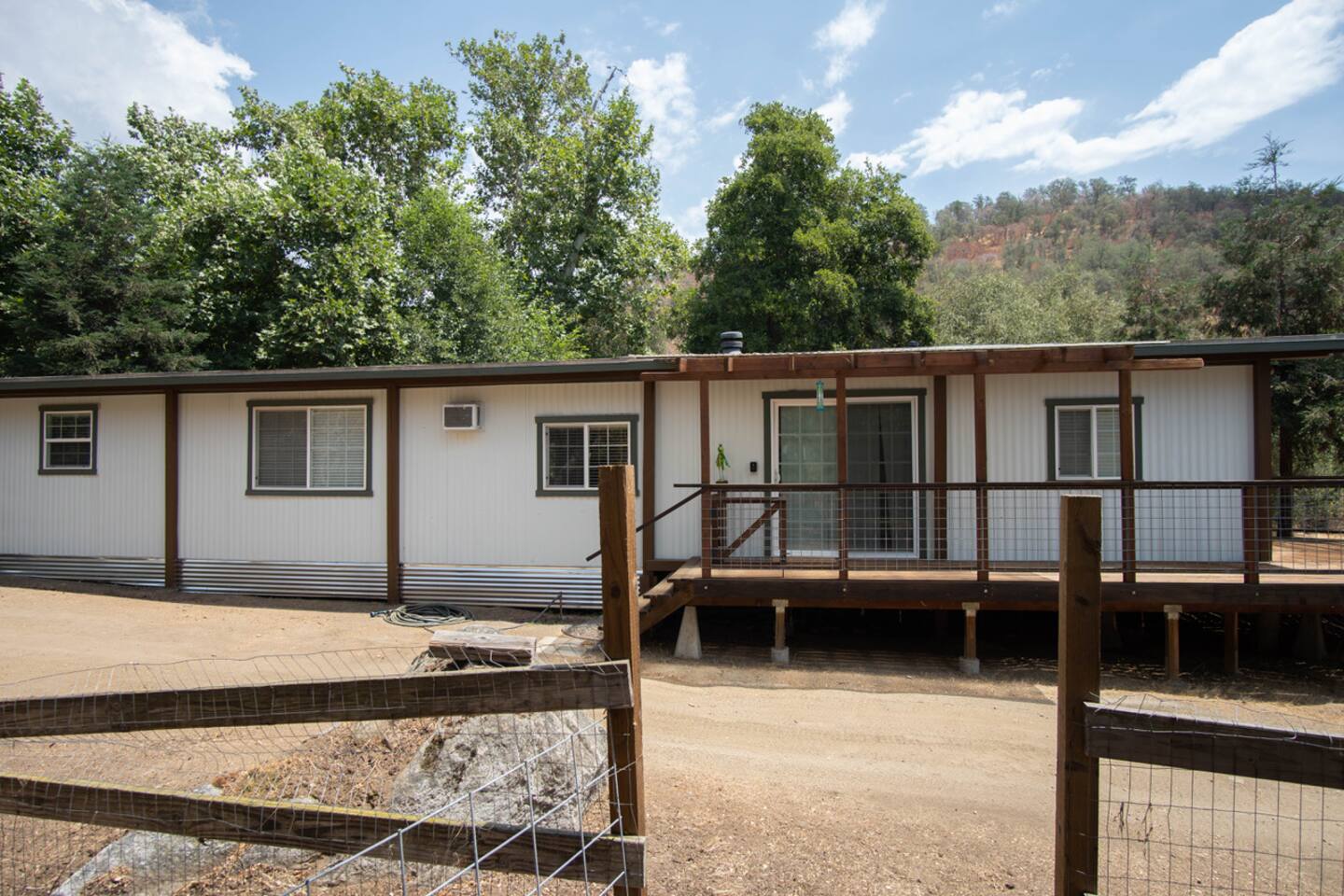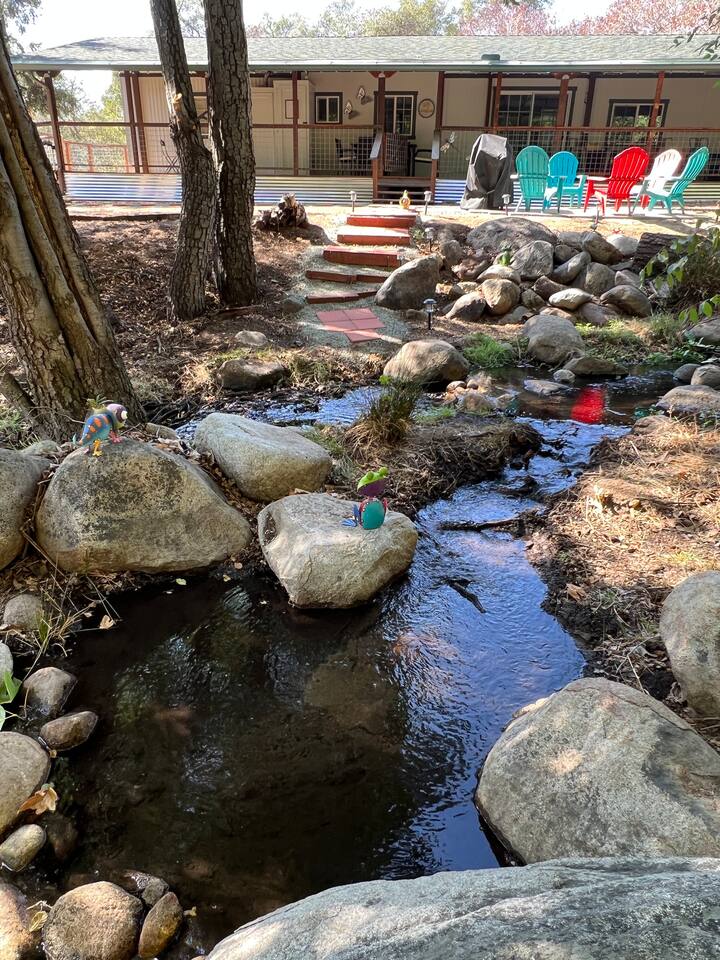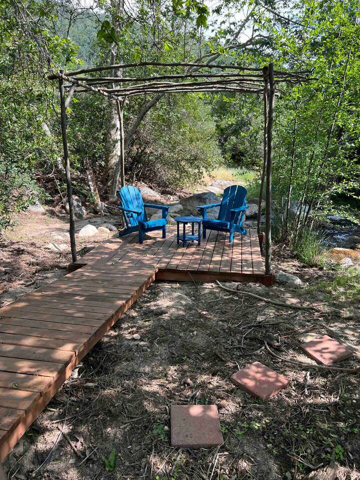 Welcome to Lone Wolf Outpost—a modern-rustic retreat set on a truly one-of-a-kind private creek. This is not shared river access or a pond nearby—this is your very own year-round, flowing creek with multiple sitting areas, a hammock over the water, cold plunge spot, and total privacy. Nothing else in this region offers what you’ll experience here. We’ve transformed a classic ranch mobile home into a charming, upgraded escape with brand new furniture, cozy beds, and stylish details—designed to help you reconnect with nature, your partner, or just yourself. 🌿 The Outdoor Experience Hammock suspended over the creek (perfect nap spot) Yoga/meditation deck with Adirondack chairs and table Outdoor living space with fire table (seasonal use), furniture, and shade Bistro table and bar stools on the deck railing Dining area under the covered patio Propane BBQ for outdoor meals Peaceful sounds of flowing water and wildlife all around 🛏 The Cabin Interior 2 Bedrooms | 1 Full Bath + 1 Half Bath Memory foam mattresses for cloud-like sleep Fully stocked kitchen with all essentials + brand-new appliances Dining area indoors + creekside dining outdoors Living room with smart TV (Roku guest mode), board games, and two wicker chairs Two workspaces: one in the living room, one in the second bedroom Sleeping Arrangements: Bedroom 1: Queen bed + private half bath Bedroom 2: Two single beds + private desk workspace 📶 Comfort, Tech & Connectivity Free high-speed Wi-Fi 43" TV with Roku Guest Mode (bring your login info) Washer/dryer in outdoor cabinet Hair dryer, ironing board, clothes steamer Plush towels + luxury toiletries Mini split A/C & heating in each bedroom + living area Extra floor fans (summer) and cozy blankets (winter) We recommend bringing warm clothes in winter if you're not used to mountain air, though the mini splits keep the home perfectly comfortable year-round. 📍 Location Perks Attending a wedding at Springville Ranch? We’re just 10 minutes away. Prepare in comfort, skip the long drive, and enjoy nature after the celebration. Looking to explore? Coffee Camp Campground – 20 min Balch Park – 30 min River Island Golf Course – 20 min Lake Success – 25 min Porterville – 35 min Local eats: Cowpuncher’s Café, Java Express, Poor Richard’s Pizza 🚫 Important to Note: No filming, photography, or commercial production permitted via Airbnb. For those inquiries, please reach out directly through our website. 🧘♀️ You’ll Love This Place If You’re Into: #magical #mountainretreat #privatecreek #hammockvibes #naturetherapy #freshair #stars #birdwatching #digitaldetox #romanticgetaway #healingescape #secludedstay #forestbathing #petswelcome #reconnect #bestnightever